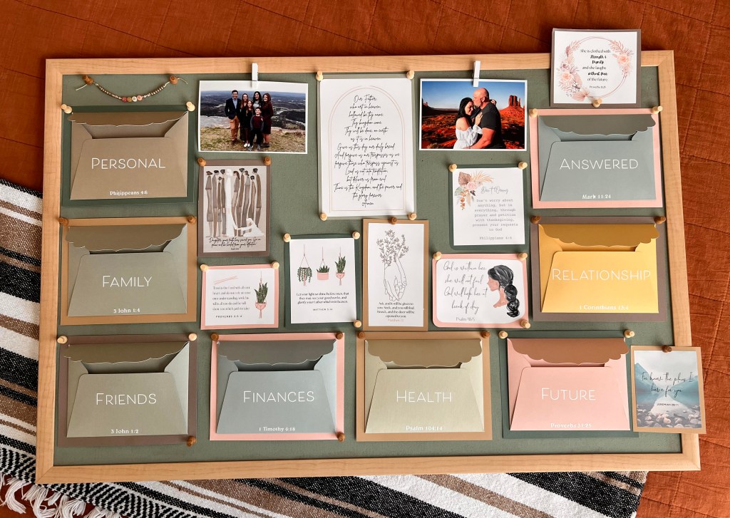 If you want to keep the board low cost, consider making your own envelopes. That’s what I did! You can hand-cut your own with free envelope templates online, or even use a Cricut, if you have one. I used pieces of card stock that I already had in colors that complimented my board’s fresh coat of paint, and some glue that I also had laying around, and it worked perfect. If you don’t have any card stock already, it’s VERY cheap in the single sheets at the local HoLo. (Hobby Lobby, if you’re wondering “Where?”. That’s what we call it at our house. Haha) On 40% off weeks, you can get it EVEN cheaper. If you’d rather skip the making of the envelopes, use the envelopes you already have or buy some that fit the vision you have for your board! When you are counting up how many envelopes you need, don’t forget the envelope for answered prayers!