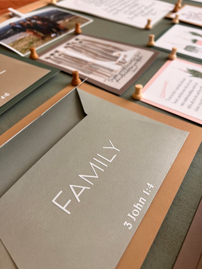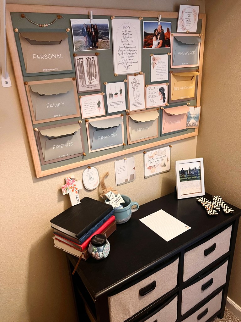 Back to the crafty stuff! I wanted to label the envelopes and I wanted to add a verse to the bottom of each envelope that meant something to me when I pray for each area/person in my life. You can absolutely handwrite your labels on your envelopes. That adds even more of a personal touch! I used my Cricut because I already had it out, making my envelopes…and I don’t love my handwriting. haha. I then attached the envelopes to scrapbook paper to create a frame-like effect for each one. The “frame” piece is what I have stuck the wooden push pins into, so that I can open and close each envelope without taking it off the board.
