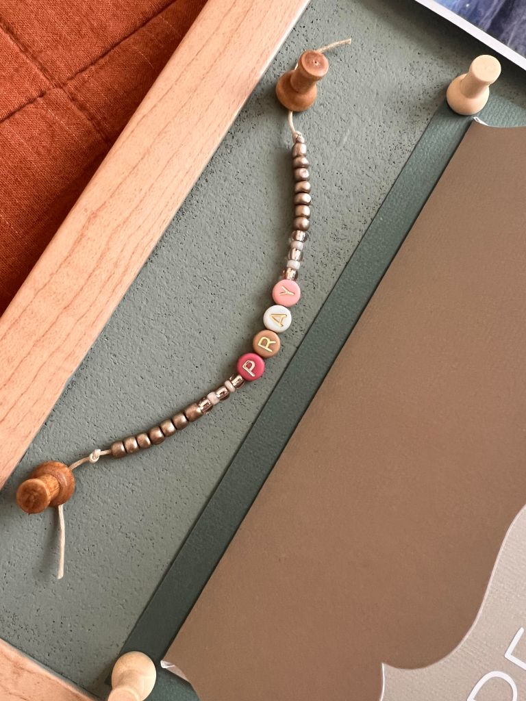 I added pictures of loved ones with white clothes pin tacks (HoLo for $1.99) and a little string of beads with the word “PRAY” made all from what we had in our craft drawer. Even if you aren’t super creative, you can absolutely pull one of these boards together.